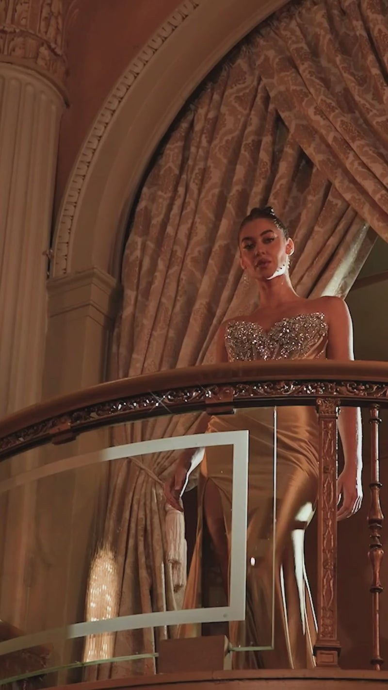 • Illusion Corset Bodice: Intricate structure offering shape, glamour, and modern sophistication.