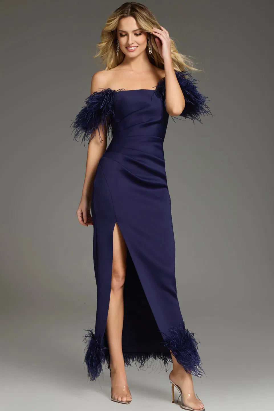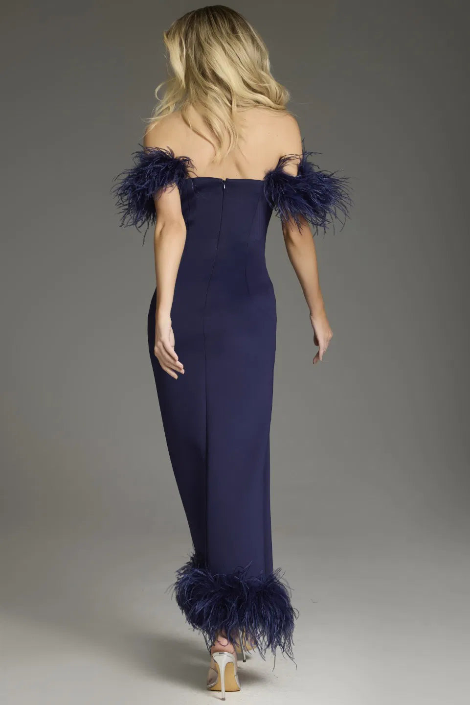 This sophisticated design features an off-the-shoulder neckline adorned with delicate feather accents, adding a touch of drama and elegance. The fitted bodice flows seamlessly into a sleek column silhouette, while the high slit enhances movement and allure.