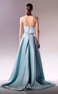 Make a breathtaking entrance in this exquisite design by MNM Couture which features a structured strapless bodice, intricately adorned with shimmering embellishments. The gown flows into a high-slit skirt, complemented by a voluminous overskirt that adds a regal touch.