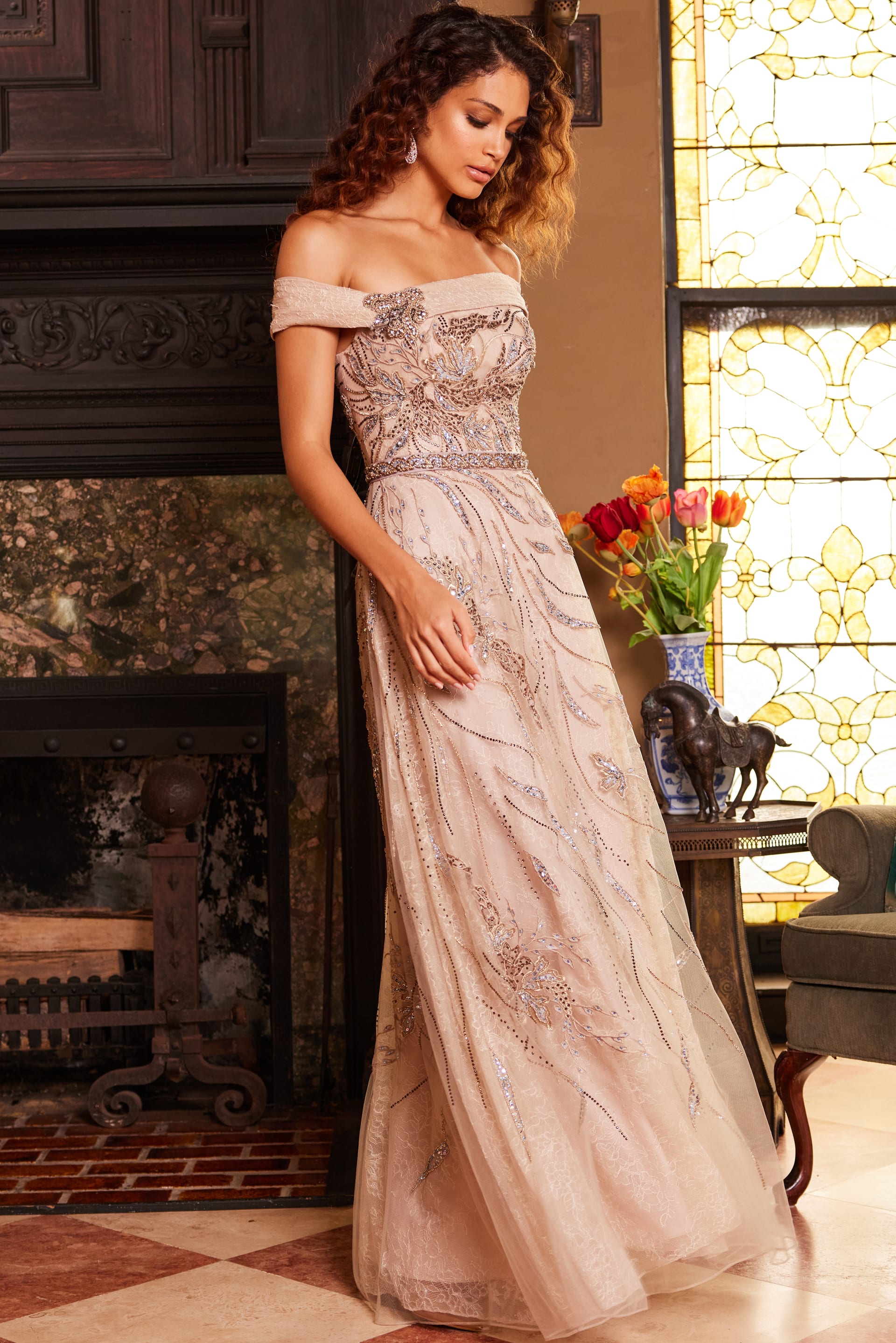 Designed with a graceful off-shoulder neckline, this gown highlights the collarbone while framing the bodice with refined structure. The fitted bodice features ornate embellishments that flow organically throughout the skirt, creating a captivating sense of movement and artistry.