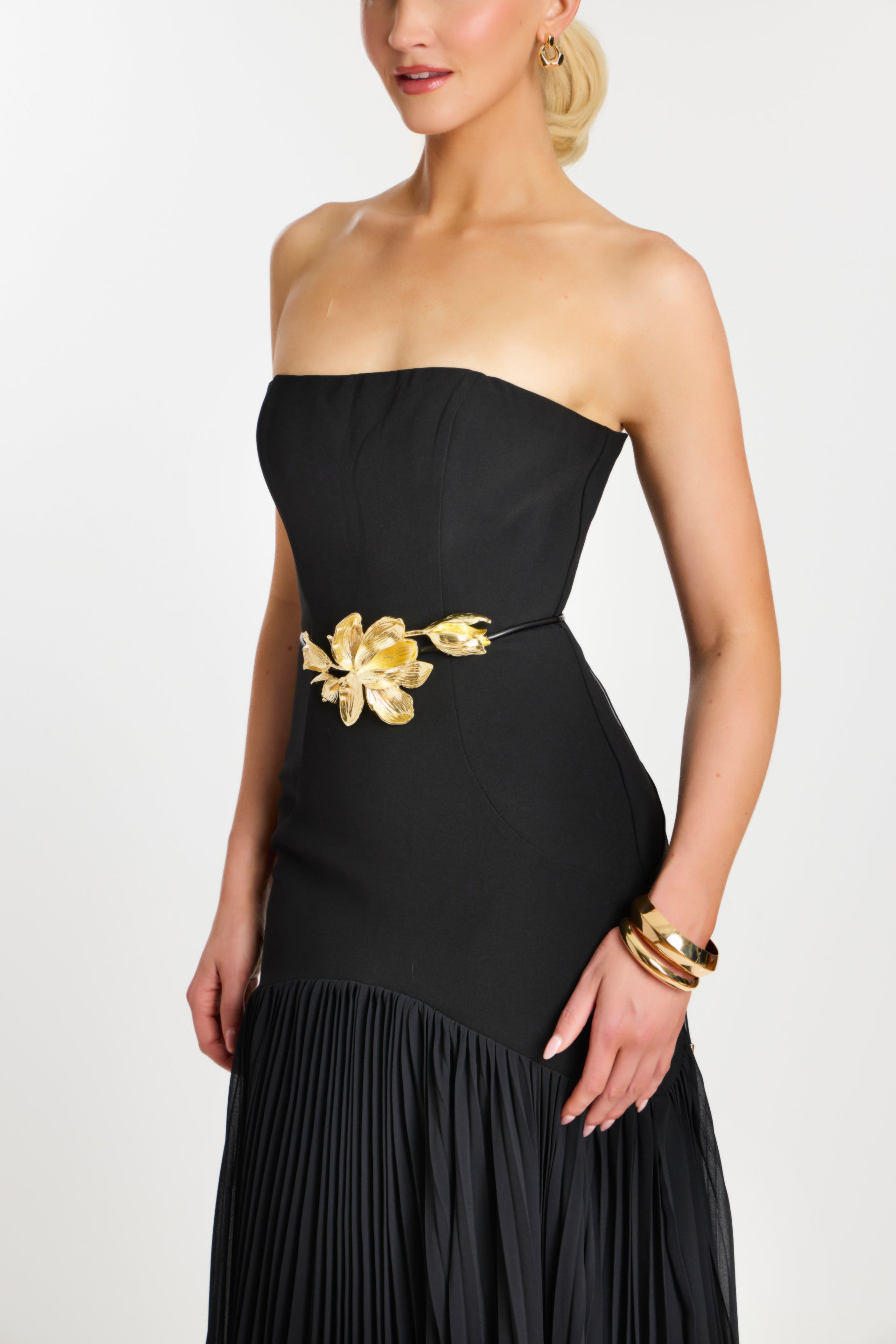 Designed with a sleek strapless neckline, the gown beautifully highlights the shoulders and collarbone while maintaining a clean, structured silhouette. A striking floral-inspired waist embellishment creates a focal point and the skirt flows into soft pleating that brings graceful movement and fluidity with every step, creating an effortlessly elegant finish.