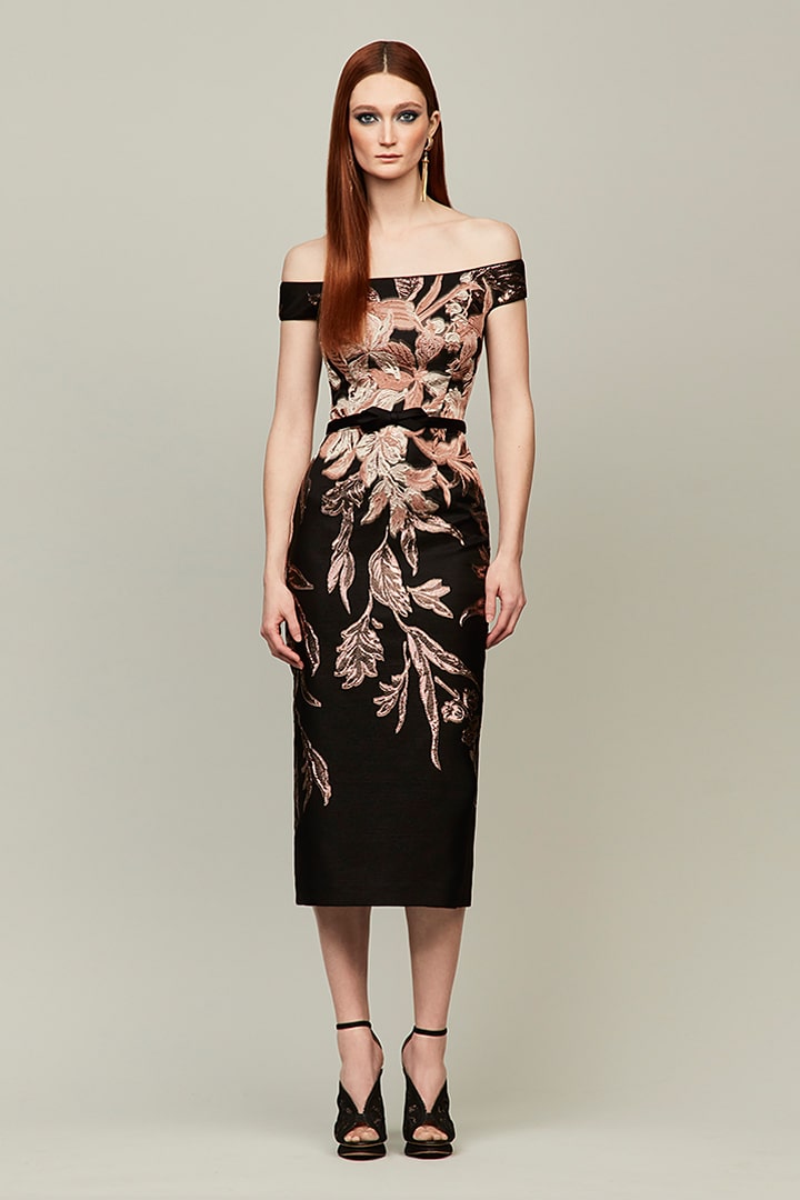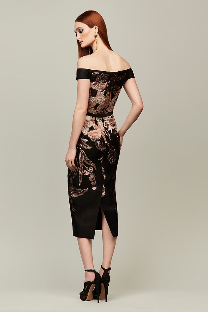 Audrey+Brooks 6339 is a tea-length dress crafted from crepe and embroidery. It features an off-the-shoulder style and bowknot detail with slit and a zipper closure at the back.
