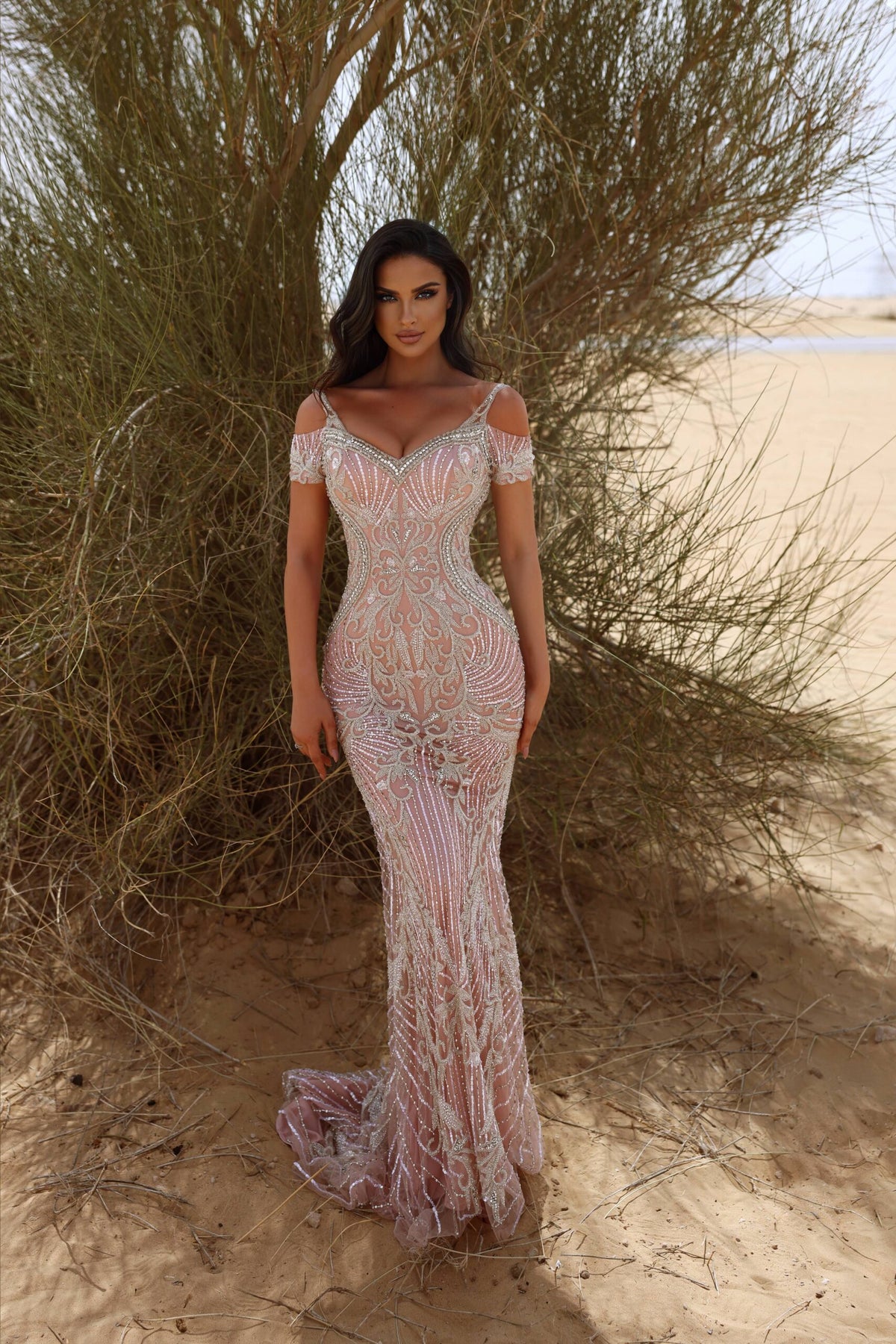 Designed for high-glamour events, this striking gown by CHIC&HOLLAND features a form-fitting silhouette adorned with intricate beadwork and shimmering embellishments. The off-shoulder design adds a touch of elegance, while the dramatic open back creates a show-stopping effect.