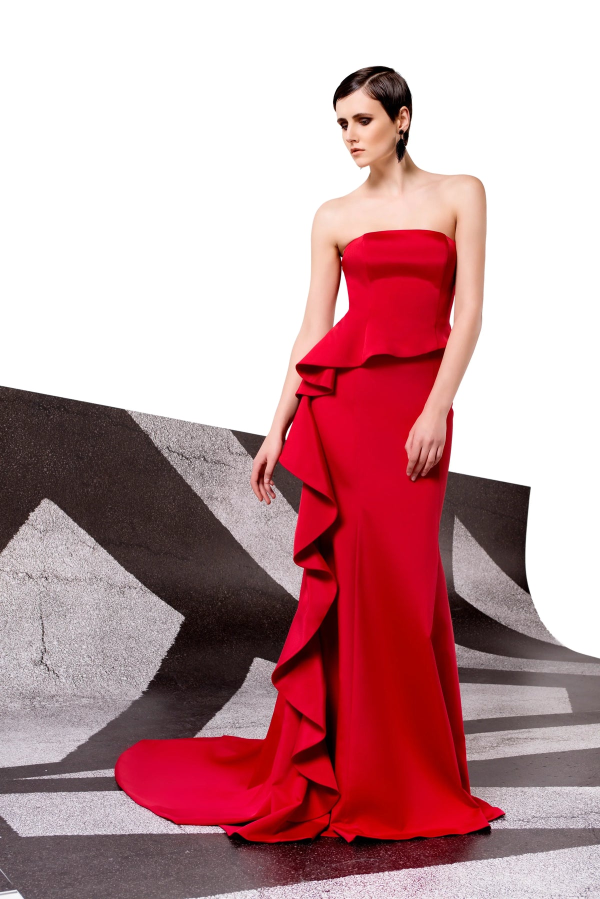 This elegant dress by John Paul Atakar features a captivating asymmetric ruffle peplum detail and a flattering mermaid silhouette and with its with its fully lined design, this dress ensures both comfort and sophistication.