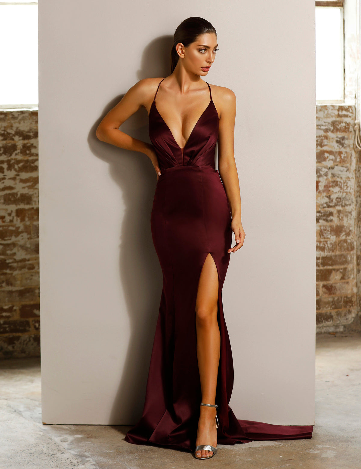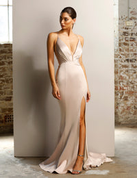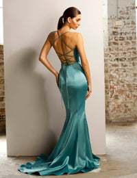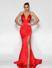 This fitted satin gown features a daring plunging neckline and a sheer panel at the bottom of the V to ensure a secure fit. The criss-crossing back straps form a striking open back, and the long skirt with a train and high leg split complete this elegant look.