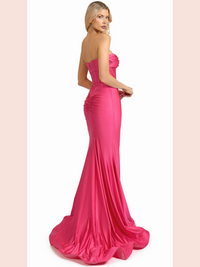 This stunning gown by Jessica Angel features a flattering strapless bodice with ruched detailing, creating a sleek silhouette. The high slit adds a daring touch, while the fitted bodice with a slight sweetheart neckline enhances the elegance of the design. The floor-length skirt with a sweeping train ensures you'll make a lasting impression at your next event. Perfect for prom or any formal evening, this gown exudes sophistication and style.