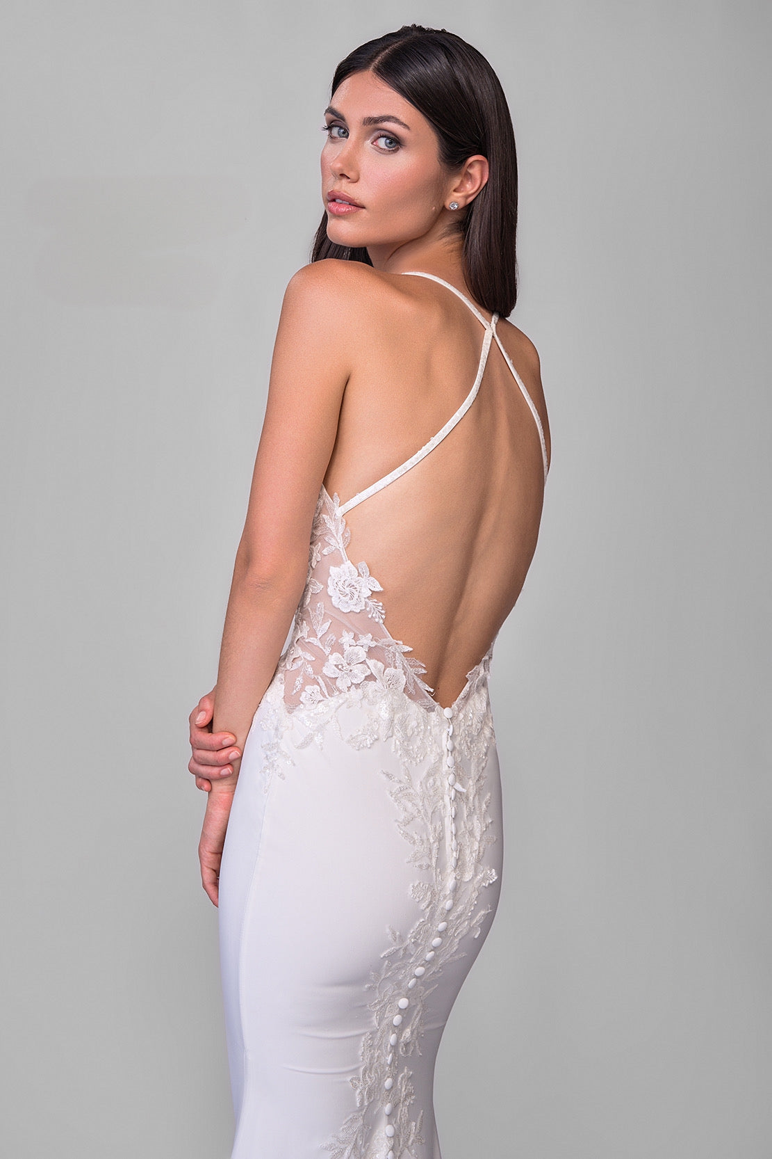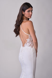 This elegant yet moden Joelle Oliva by La Femme bridal dress exudes sophistication with its luxurious jersey and lace converge, creating a timeless silhouette. The lace applique boned bodice, illusion sides, and low back add allure, while delicate shoulder straps and button detailing enhance the classic charm.