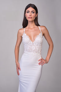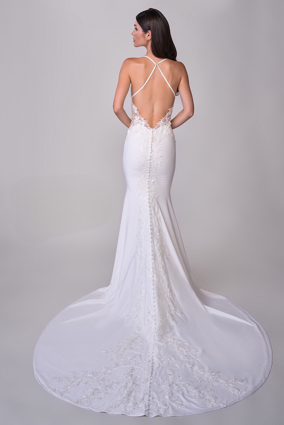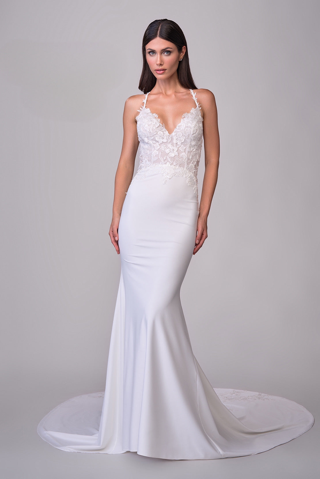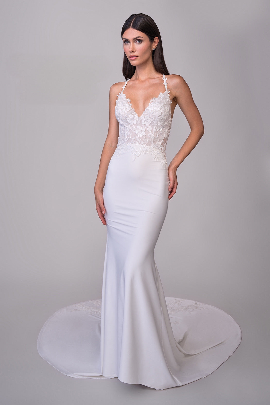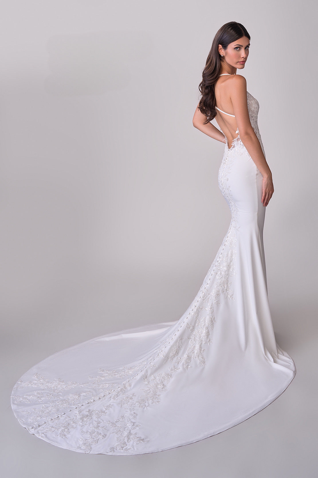 A sweeping train completes the look, making it perfect for brides seeking modern elegance with a touch of tradition.