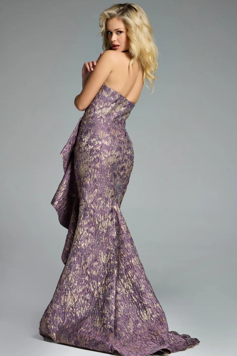 This head turning gown by JOVNI features a structured strapless bodice that seamlessly flows into a figure-hugging mermaid silhouette, designed to highlight your curves with sophistication. The textured fabric showcases a metallic sheen, while the cascading ruffle detail adds a dramatic and regal finish.