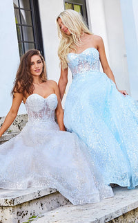 This dazzling ballgown by JVN features a sheer corset bodice with boning for a flattering fit. The intricate lace embroidery on the bodice adds a touch of sophistication, while the strapless sweetheart neckline enhances your natural beauty.