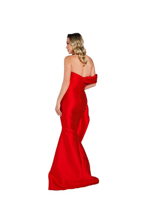 Featuring a striking asymmetrical shoulder overlay and a dramatic sculpted silhouette, this design by Nicole Bakti evokes pure red carpet glamour. The fitted bodice is accented with a structured drape and subtle crystal embellishment at the neckline, while the back reveals a bold cascading bow detail that adds elegance from every angle.