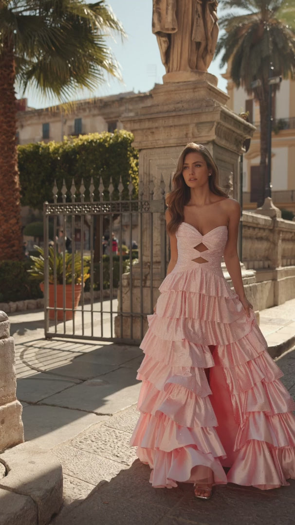 Sherri Hill 57416 is a head-turning statement gown designed to dazzle on the most glamorous occasions. The strapless bodice features eye-catching keyhole cutouts and a flattering sweetheart neckline, while the tiered ruffle skirt cascades to the floor with dramatic flair.