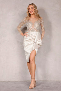 This exquisite cocktail dress by Terani Couture features a boat neck and pleated peplum detail which creates a flattering silhouette. The sheer beaded bodice and long sleeves are a masterpiece of intricate detailing, with beaded accents continuing down the arms.