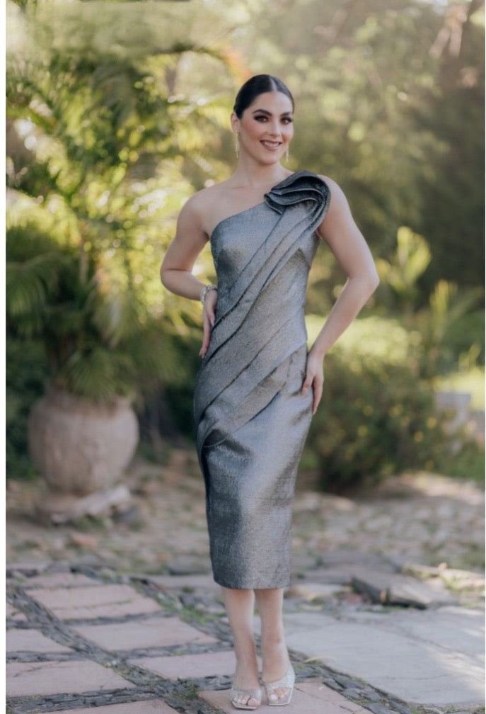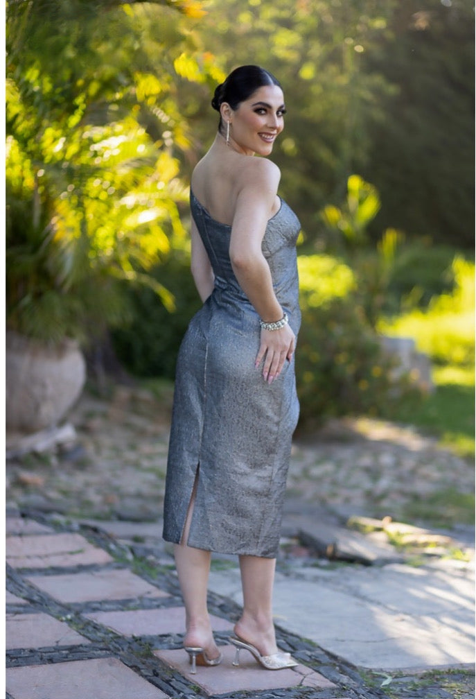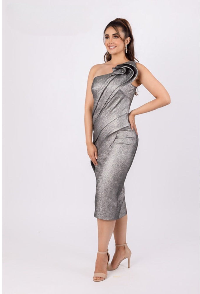 TERANI - 232C1138 - Tea Length Shiny Metallic Bodycon Sleeveless Dress