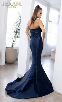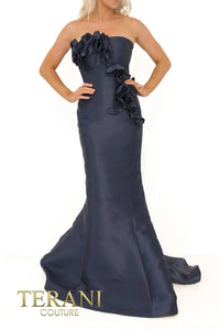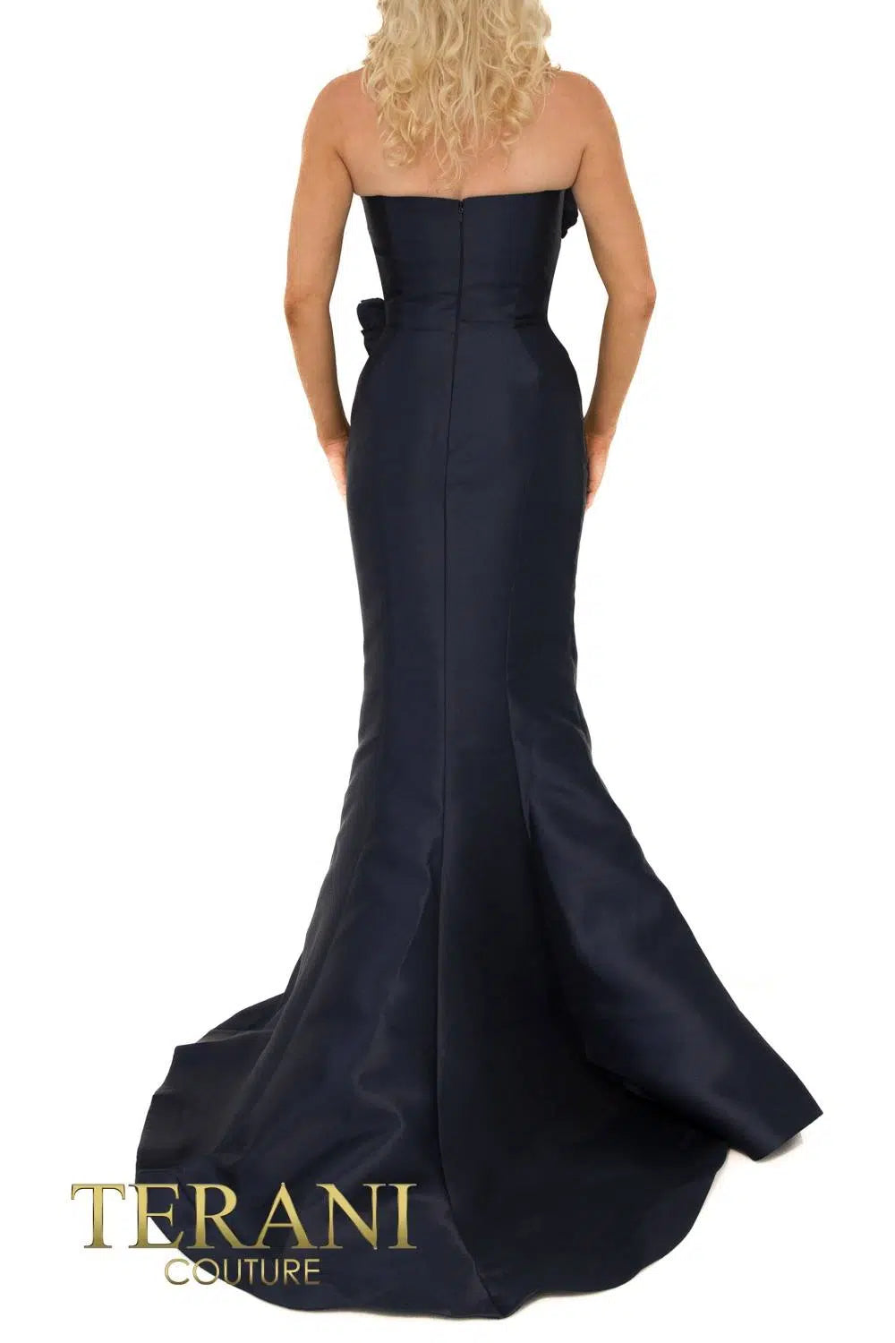 This midnight-colored Strapless Mermaid Gown by TERANI COUTURE features a flattering mermaid silhouette and is adorned with beautiful flowers with beaded centers that elegantly drape across the bodice to the left hip.